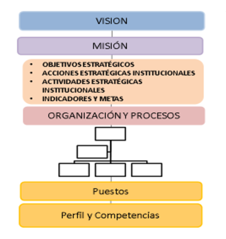En el siguiente gráfico, se muestra el alineamiento organizacional, desde los puestos y unidades organizacionales hacia los objetivos, misión y visión de la empresa: