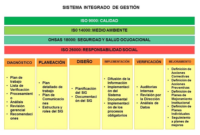 Apoyamos a la organización en la implementación de los ISO 9000 (Calidad), ISO 14000 (Medio Ambiente), OHSAS 18000 (Seguridad y Salud Ocupacional), e ISO 26000 (Responsabilidad Social) en forma individual o grupal, con la finalidad de estar en condiciones para aprobar a la Auditoria por parte de las Certificadoras.